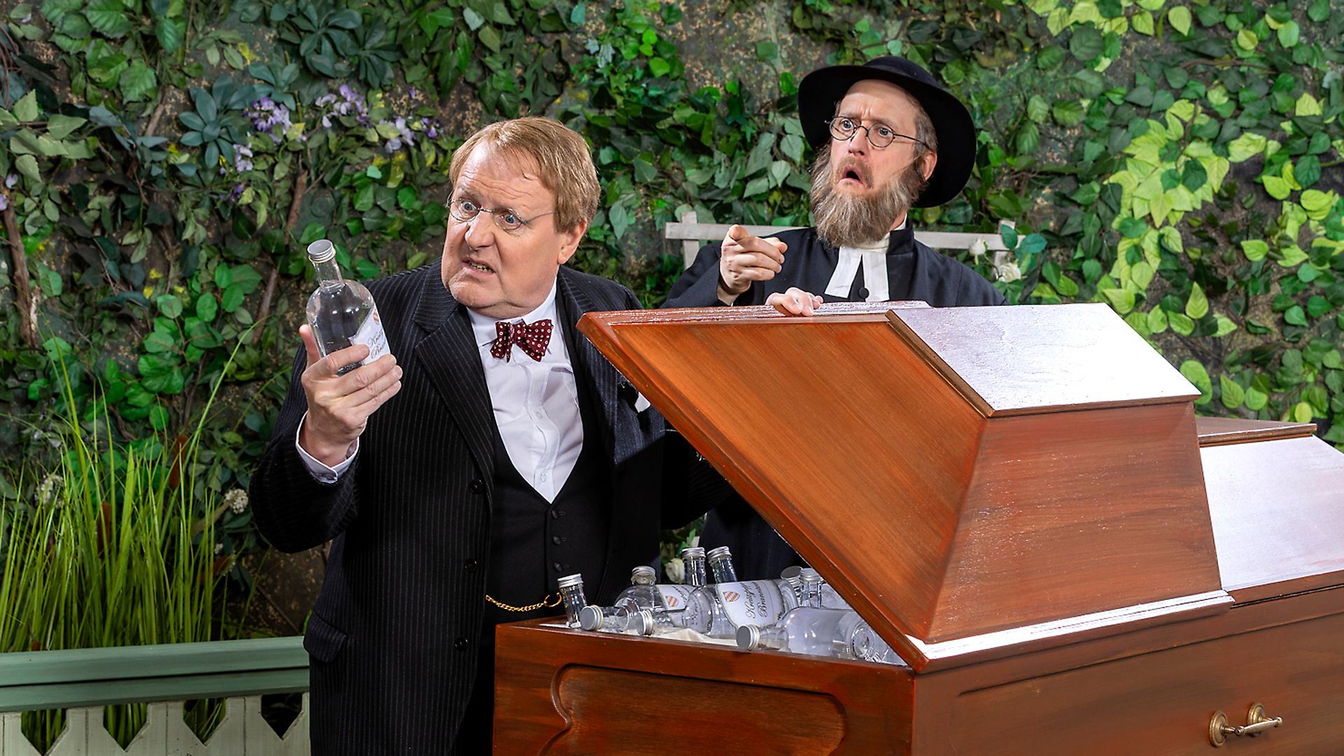 Med ett sönderfallande badhotell fullt med smuggelbrännvin, ett lik på villovägar, hotande spritpoliser, alldeles för många präster samt en kista som aldrig verkar innehålla det den ska – är cirkusen snart total!